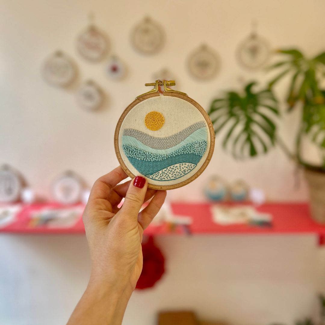 Χειροποίητο κέντημα σε βαμβακερό ύφασμα, σε τελάρο διαμέτρου 10 εκατοστών.