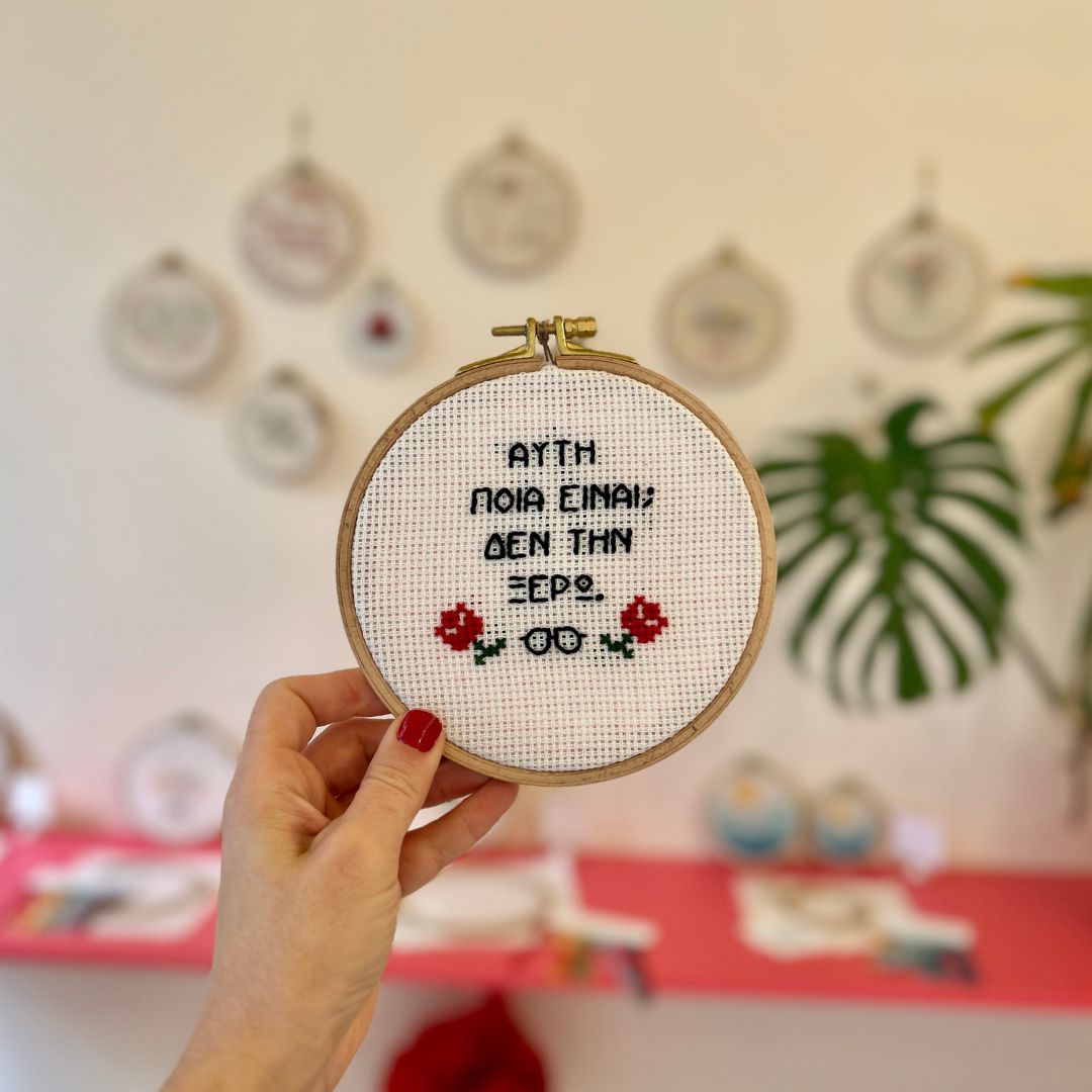 Χειροποίητο κέντημα σε βαμβακερή εταμίνα, σε τελάρο διαμέτρου 13 εκατοστών.